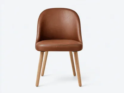 Siedzisko oraz oparcie pokryte są skórą ekologiczną w kolorze brązowym o naturalnym wyglądzie. Nogi wykonane z drewna w jasnym odcieniu zapewniają stabilność i trwałość konstrukcji. Całość została starannie wykończona, co podkreśla estetykę produktu.