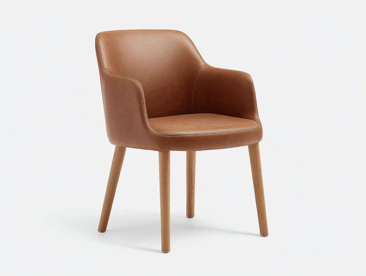 Siedzisko oraz oparcie pokryte są skórą ekologiczną w kolorze brązowym o subtelnym wykończeniu. Nogi wykonane z drewna w naturalnym odcieniu zapewniają stabilność i trwałość konstrukcji. Starannie wykończone krawędzie podkreślają jakość wykonania oraz spójność formy.