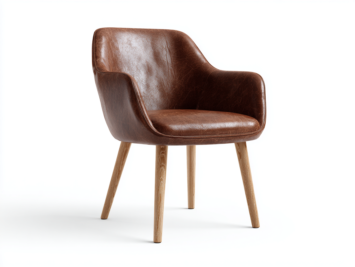 Siedzisko oraz oparcie pokryte są skórą ekologiczną w kolorze brązowym o naturalnym wyglądzie i delikatnej strukturze. Nogi wykonane z drewna w jasnym odcieniu zapewniają stabilność oraz trwałość konstrukcji. Starannie wykończone detale podkreślają wysoką jakość wykonania.