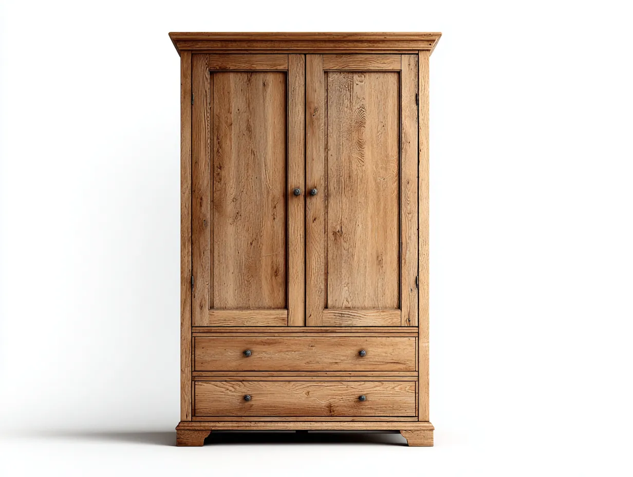 Szafa została wykonana z drewna w wybarwieniu dąb rustykalny. Widoczna struktura słojów oraz staranne wykończenie nadają meblowi autentyczny charakter i podkreślają jego trwałość. Konstrukcja zapewnia stabilność oraz długotrwałe użytkowanie.