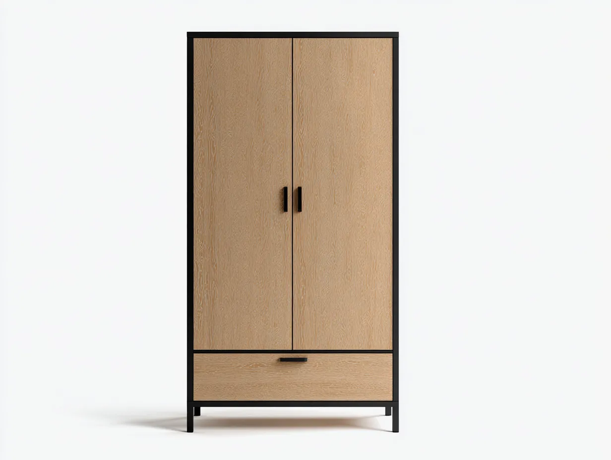 Szafa z kategorii Szafy dwudrzwiowe to praktyczne rozwiązanie do przechowywania odzieży oraz tekstyliów w sypialni, garderobie lub pokoju dziennym. Połączenie dekoru drewna z czarnymi elementami konstrukcyjnymi nadaje meblowi wyrazisty, industrialny charakter, który dobrze komponuje się z nowoczesnymi wnętrzami.